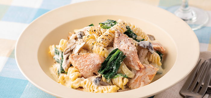 ビタミンDを含む鮭やきのこと、カルシウム豊富な牛乳・乳製品をあわせて摂れる一品。コクのあるクリームパスタは寒い季節にピッタリです。