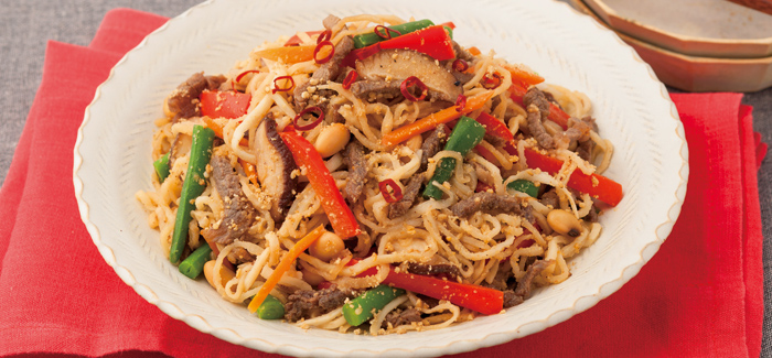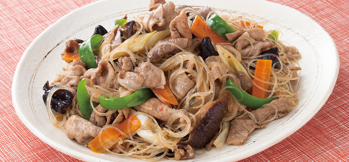 もどした切り干し大根を肉や野菜と炒めて主菜に。春雨の代わりに使ってチャプチェ風の炒め物ができます。