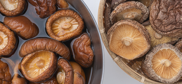 乾しいたけは、できるだけ低い温度での水もどしが、ふっくらとやわらかくなり、また加熱時にうま味成分の増加が多くなります。水に浸けて冷蔵庫で2時間~ひと晩ほど置いておくのが最もおすすめですが、時短したいときはぬるま湯や電子レンジを使っても。かさの薄いものは、水に浸ける前にパキパキと手で割っておけばより短い時間でもどせます。もどした水にはうま味成分や、カリウム、鉄などのミネラルが溶け出しているため、ぜひ煮汁として使いましょう。刻んで餃子に入れたり、洋風の料理ならリゾットやトマト煮込み、きのこのパスタにも。和洋中どんなメニューに使っても、乾しいたけのおかげで料理が深い味わいになります。