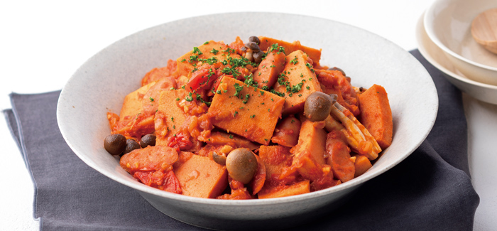 トマトとウインナーの旨みが高野豆腐にギュッとしみ込むこんなひと皿も。