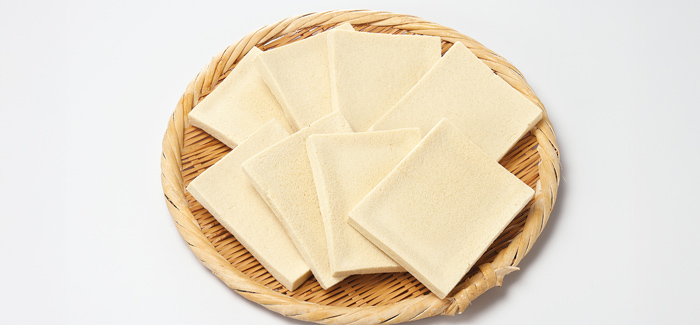 国産丸大豆とにがりだけで作った、昔ながらのしっかりとした食感の高野豆腐。消泡剤や、食感をやわらかくする重曹を使用していません。